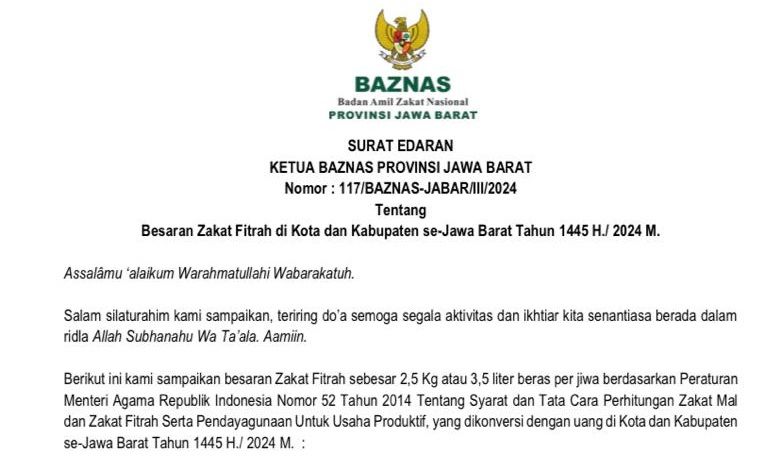 BERITAINSPIRATIF.COM - Badan Amil Zakat Nasional (BAZNAS) Jawa Barat telah menetapkan besaran zakat fitrah untuk tahun 2024 berdasarkan surat edaran BAZNAS Provinsi Jawa Barat Nomor: 117/BAZNAS-JABAR/III/2024.