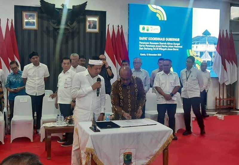 Hal itu disampaikan KDM dalam Rapat Koordinasi Penataan Kawasan DAS serta Penataan Areal Marka Jalan Nasional dan Gerbang Tol di Wilayah Jawa Barat, di Ruang Rapat Lantai 3 Gedung Singaperbangsa, Kantor Bupati Karawang, Kamis (13/11/2025) sore.